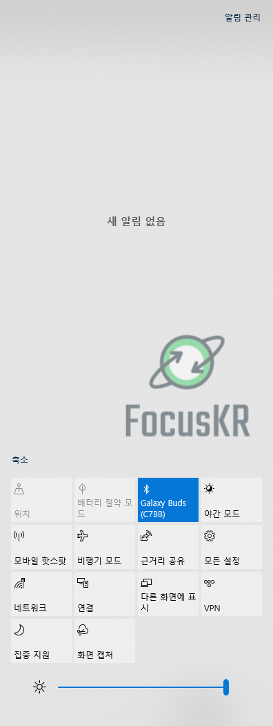 보통은 오른쪽에 자리를 잡고 있는데요. 이 알림센터는 앱이나 시스템에서 발생한 알림을 한 군데에 모아주는 기능을 하고 있으며 하단에는 기본적인 기능에 대한 토글 버튼이 자리를 잡고 있습니다.
