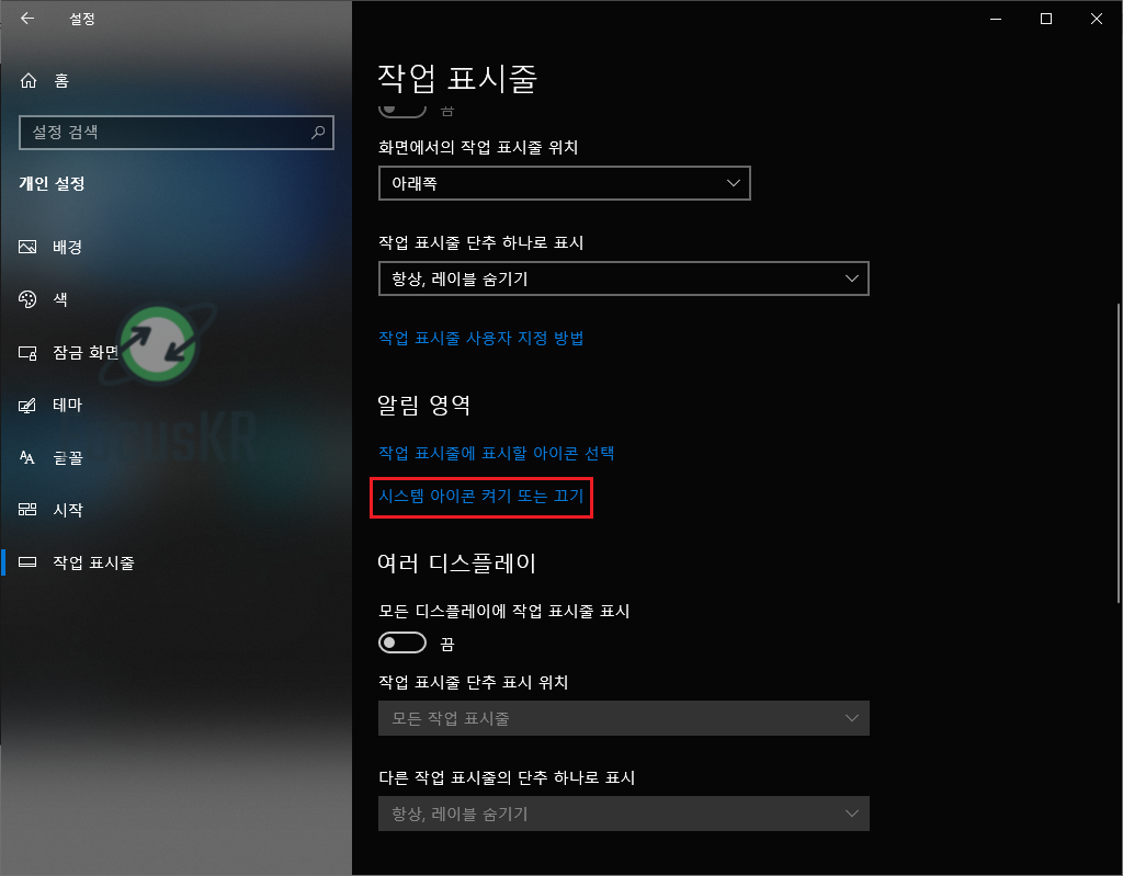 6. 하단에 있는 '시스템 아이콘 켜기 또는 끄기'를 눌러줍니다.