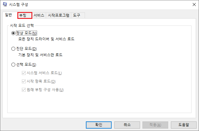 2. 상단 '부팅' 탭을 누릅니다.