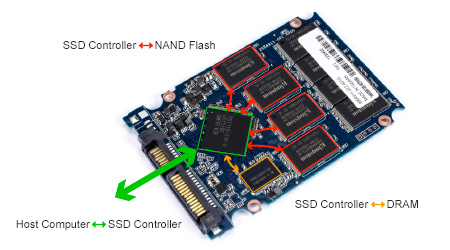 컨트롤러란 이미지에 표시한 초록색 표시와 같이 SSD의 전반적인 IO와 시스템을 담당하는 IC 칩이며 해당 칩이 고장 나게 되면 인식이 안되므로 사실상 CPU와 같은 존재라고 보시면 이해하기 쉽습니다.