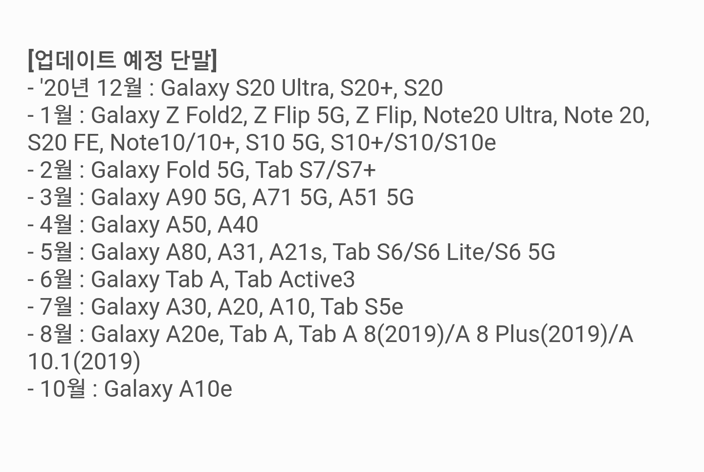 필자가 날짜를 정확하게 알아보려고 여러 루트를 통해 알아본 결과 갤럭시 S20 시리즈는 12월 3일에 업그레이드가 진행되었으며 노트20 시리즈과 노트10 시리즈, S10 시리즈, 갤럭시 Z 폴드2, Z 플립은 1월 중으로 업데이트될 것으로 보고 있습니다.