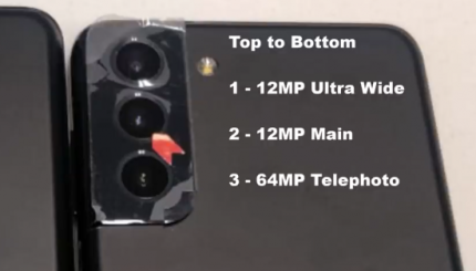 갤럭시 S21 플러스 모델은 6400만 망원 카메라와 1200만 메인, 초광각 카메라가 탑재되어 있고 자동 초점 센서는 없으며 LED 플래시가 카메라 섬 바깥에 차리를 잡고 있습니다.