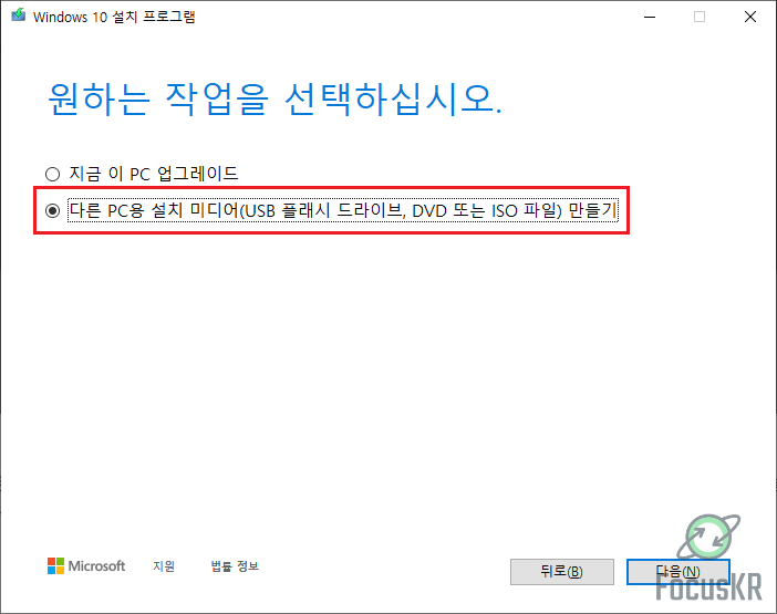 4. 과정이 완료되었다면 현재 PC를 업그레이드할 건지, 설치용 미디어를 만들 것인지 물어보는데 '다른 PC용 설치 미디어(USB 플래시 드라이브, DVD 또는 ISO 파일) 만들기'를 선택하고 '다음(N)'을 눌러줍니다.