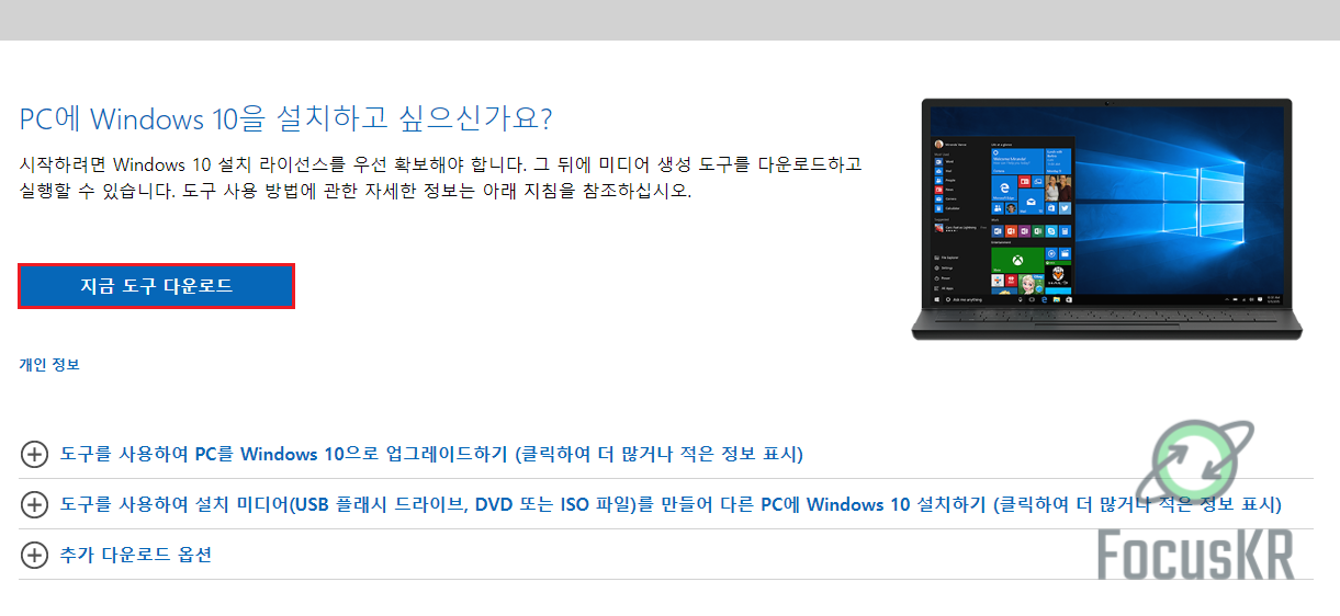 1. 가장 먼저 윈도우 10 다운로드 페이지로 이동하고 도구를 다운로드합니다.