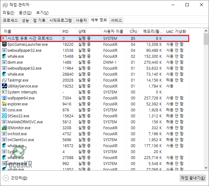 작업 관리자의 상세정보를 보게 되면 항상 표시되고 있는 '시스템 유휴 시간 프로세스' 라는 것이 있습니다.