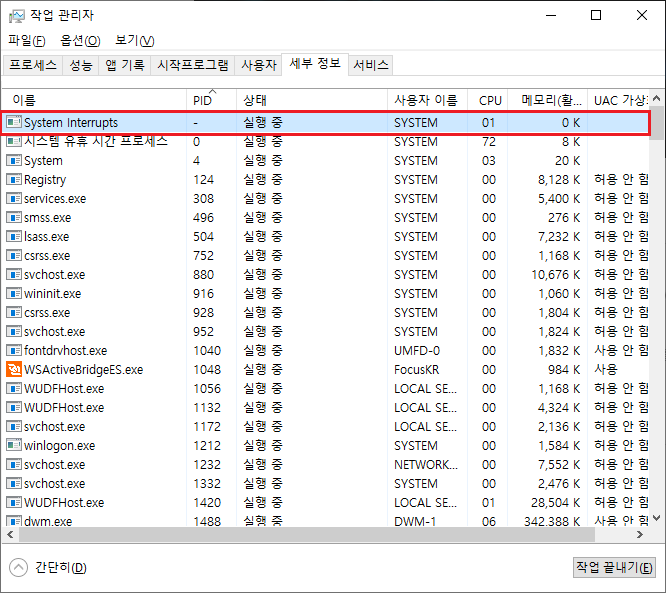 만약에 System Interrupts에 점유율이 증가한다면 제일 먼저 재부팅을 해보시고 재부팅을 하고도 해결이 되지 않으신다면 가장 최근에 설치했던 소프트웨어나 하드웨어를 제거해보시는 것을 권장합니다.