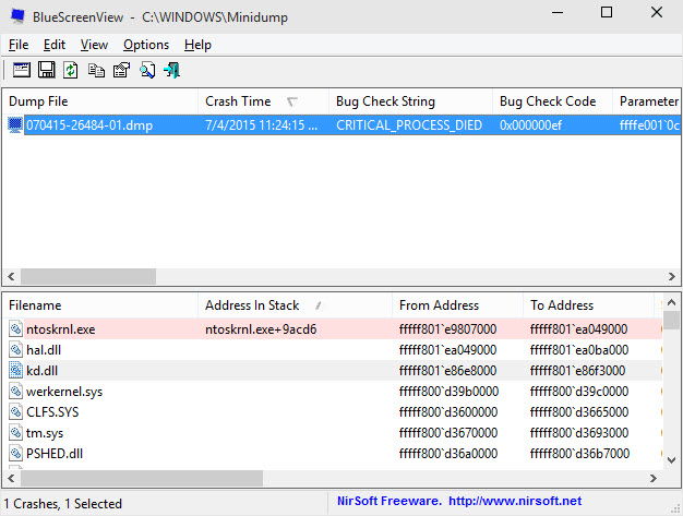 BlueScreenView v1.55 Copyright (c) 2009 - 2015 Nir Sofer Related Utilities WinCrashReport - Displays a report about crashed Windows application. WhatIsHang - Get information about Windows software that stopped responding (hang) AppCrashView - View ap