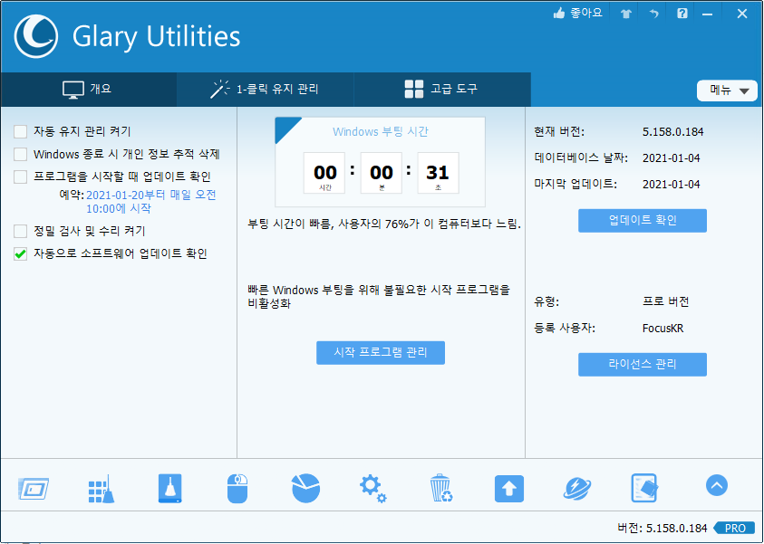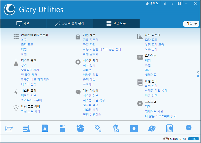 Glary Utilites는 시스템 최적화 프로그램 겸 유틸리티 도구를 제공하는 다목적 유틸리티 프로그램이며 무료로도 사용할 수 있으나 유료버전과 무료버전이 나뉘어 있으므로 필요한 기능에 따라 정하시면 됩니다.