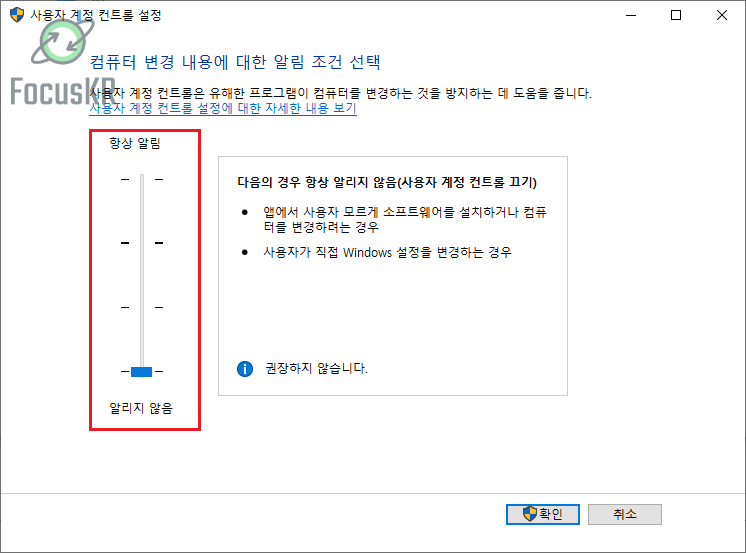 이렇게 하시면 사용자 계정 컨트롤을 비활성화하실 수 있습니다.