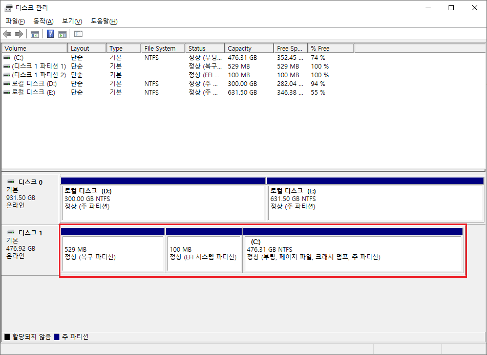 가장 대표적인 것은 복구 파티션과 EFI 시스템 파티션으로 명명되어 있습니다.