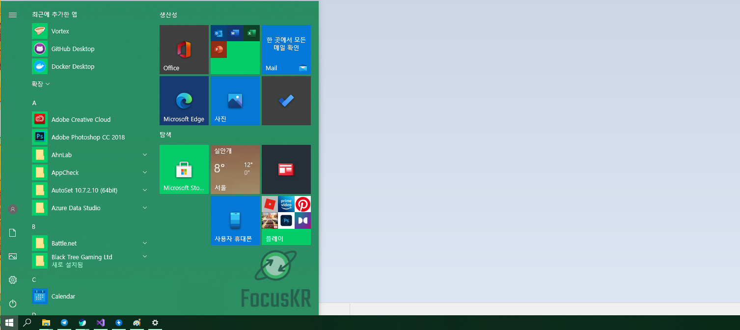 제목과 마찬가지로 작업표시줄의 색상을 변경하는 방법에 대해 알려드리려고 합니다. 그렇게 어렵지 않으니 쉽게 따라 하실 수 있습니다.