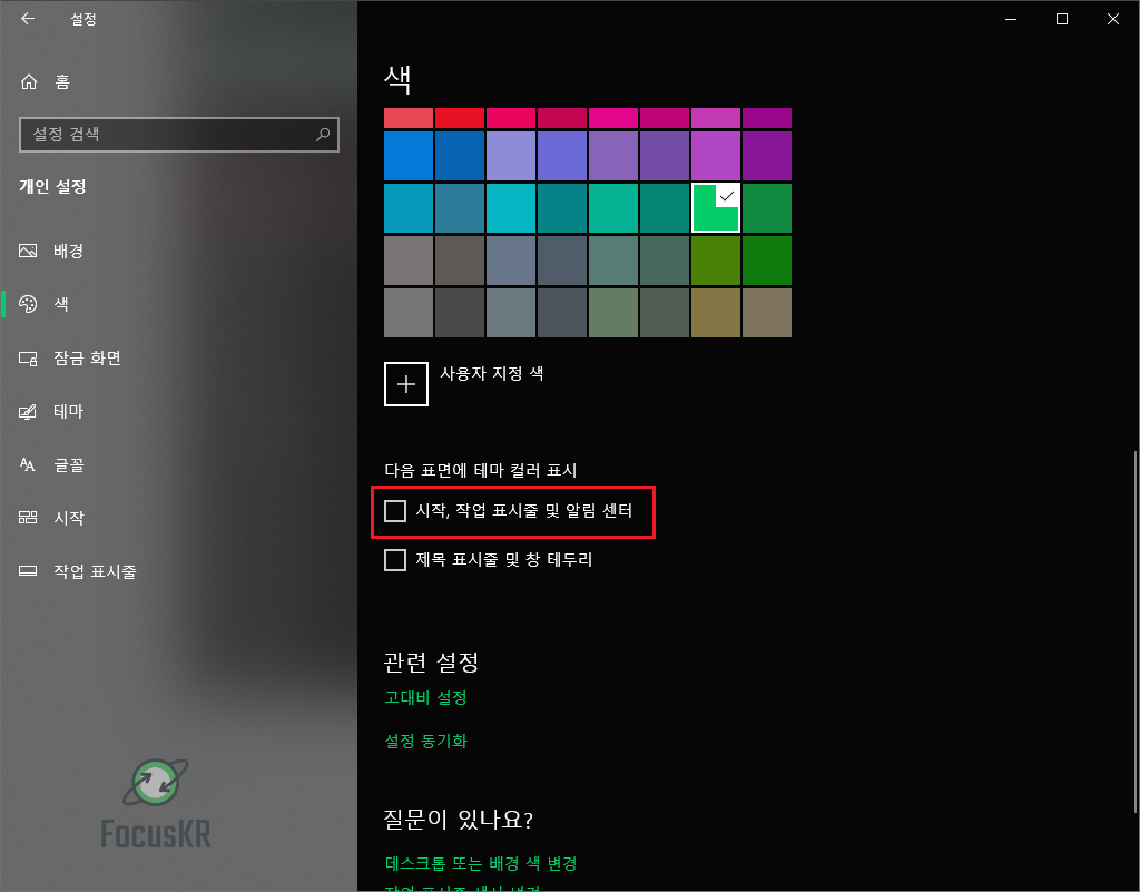 작업표시줄 컬러를 변경하기 위해서 반드시 윈도우10 어두운 테마를 사용하셔야 색상을 오버레이로 적용할 수 있습니다.