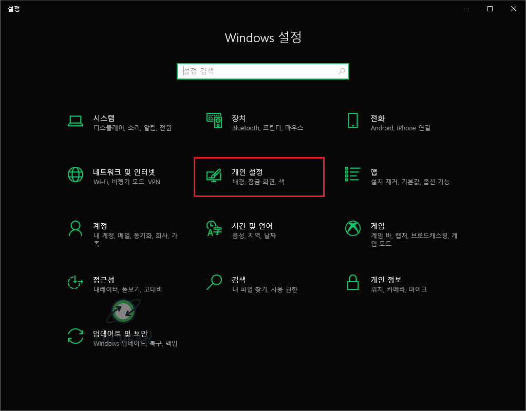 1. 윈도우 키 + i를 동시에 눌러 설정 창을 띄우고 '개인 설정'을 눌러줍니다.