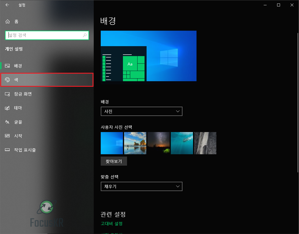 2. 왼쪽 사이드 메뉴에서 '색' 을 클릭합니다.