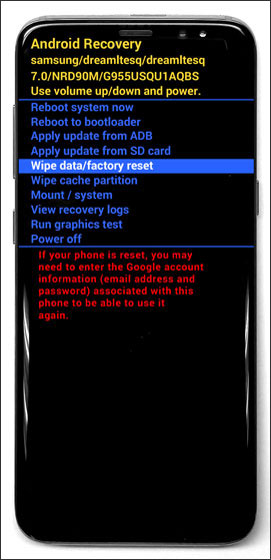 2. 볼륨 업/다운 키를 사용하여 'Wipe data/factory reset'으로 맞춰 주신 다음 전원 버튼을 눌러 선택해줍니다.