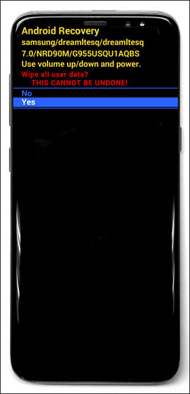 3. 볼륨 업/다운 키를 사용하여 'Yes'로 맞춰주신 다음 전원 버튼을 누르시면 완전한 공장초기화가 가능합니다.