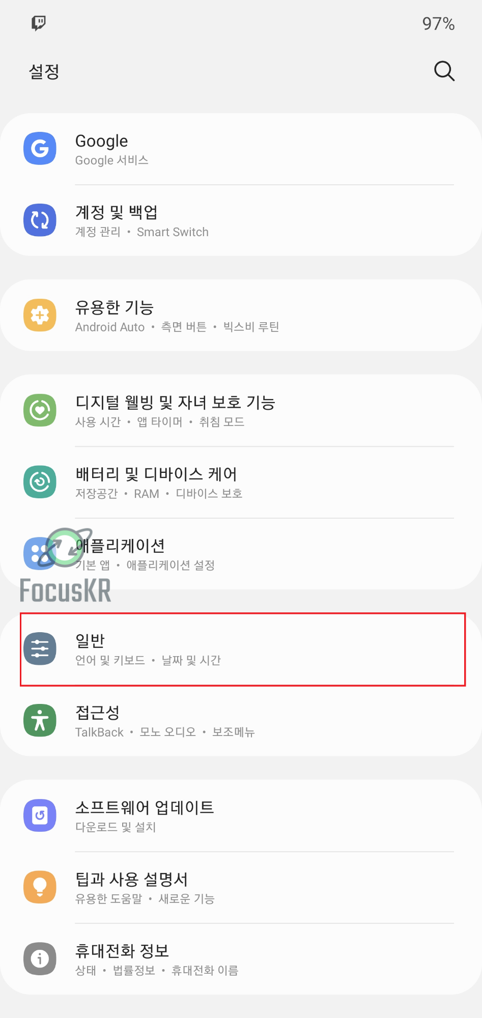 1. 가장 먼저 삼성전자 스마트폰에서 '설정'을 접근하신 다음 밑에 내리시다 보면 보이는 '일반'을 터치합니다.