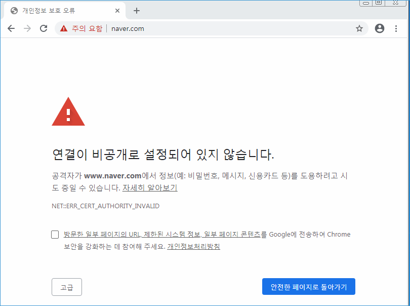 인증서에 문제가 있거나 프로토콜을 정상적으로 인증을 할 수 없는 상태인 경우 위와 같이 각 브라우저에서 해당 보안 프로토콜은 정상적인 암호화가 되어있지 않거나 페이크이니까 접근하지 말라면서 접근할 때마다 나타나게 됩니다.