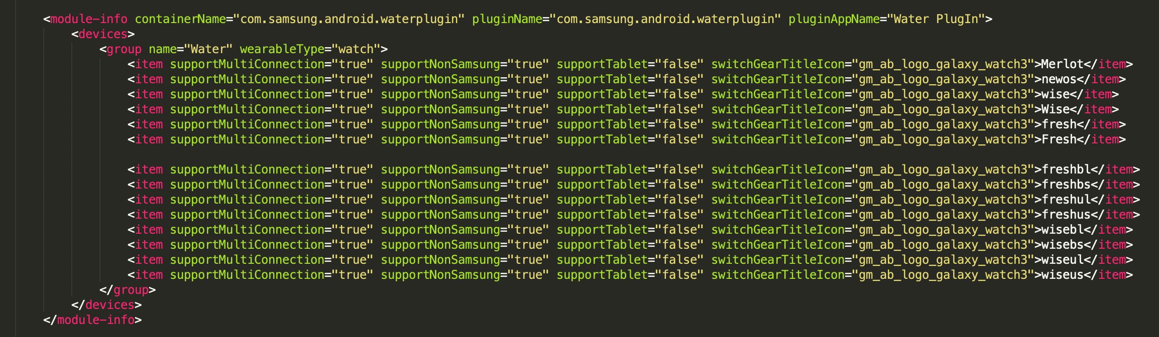 또한 똑같은 앱을 확인해보면 새로운 갤럭시 워치 시리즈의 코드가 기록되어 있었으며 기존에 알려진 정보와 비교를 해보면 갤럭시 워치 시리즈를 의미하는 'wise', 갤럭시 워치 액티브 시리즈를 의미하는 'fresh'가 기록되어 있었습니다.