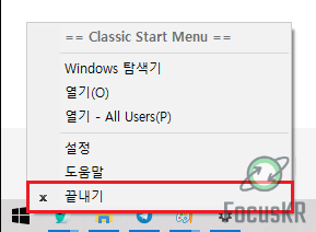 해당 시작 메뉴를 종료하고 싶으시다면 설치를 제거하시거나 아래 이미지와 같이 시작 버튼을 오른쪽 마우스 클릭하시면 종료하실 수 있습니다.
