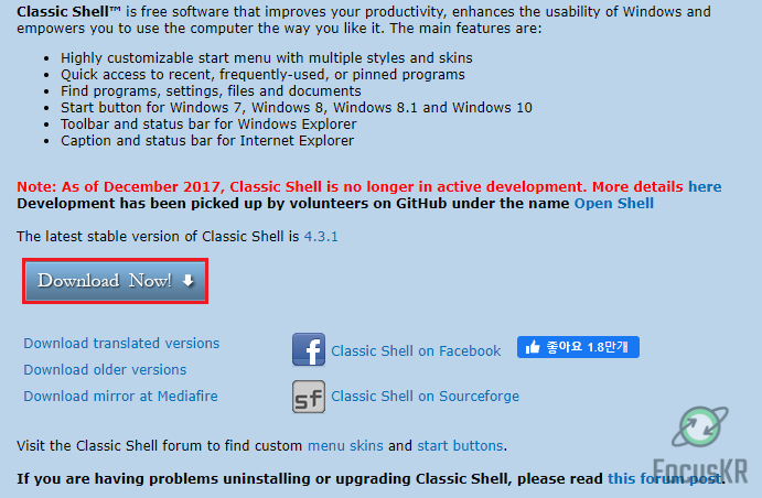 Dec 3rd, 2017 - Classic Shell is no longer actively developed After 8 years I have decided to stop developing Classic Shell. The source code for the latest version is released on SourceForge. More details here. It officially supports the Creators Update fo