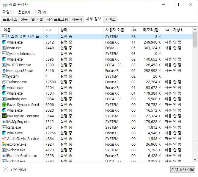 작업 관리자의 상세정보를 보게 되면 항상 표시되고 있는 '시스템 유휴 시간 프로세스' 라는 것이 있습니다. 다른 프로세스에 비해 어마 무시한 CPU 사용률을 표시하면서 항상 실시간으로 변화되