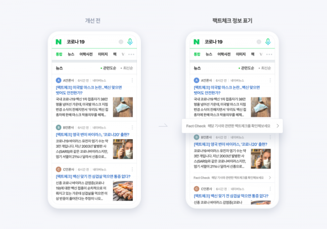 네이버 뉴스는 30일부터 허위 정보 뉴스와 가짜 뉴스 같은 이용자들에게 혼동을 줄 수 있는 정보는 여러 단계로 분류하고 정상적인 기사는 팩트체크를 표시하여 이용자들에게 공인된 정보임을 알려주는 방식으로 강화하였습니다.