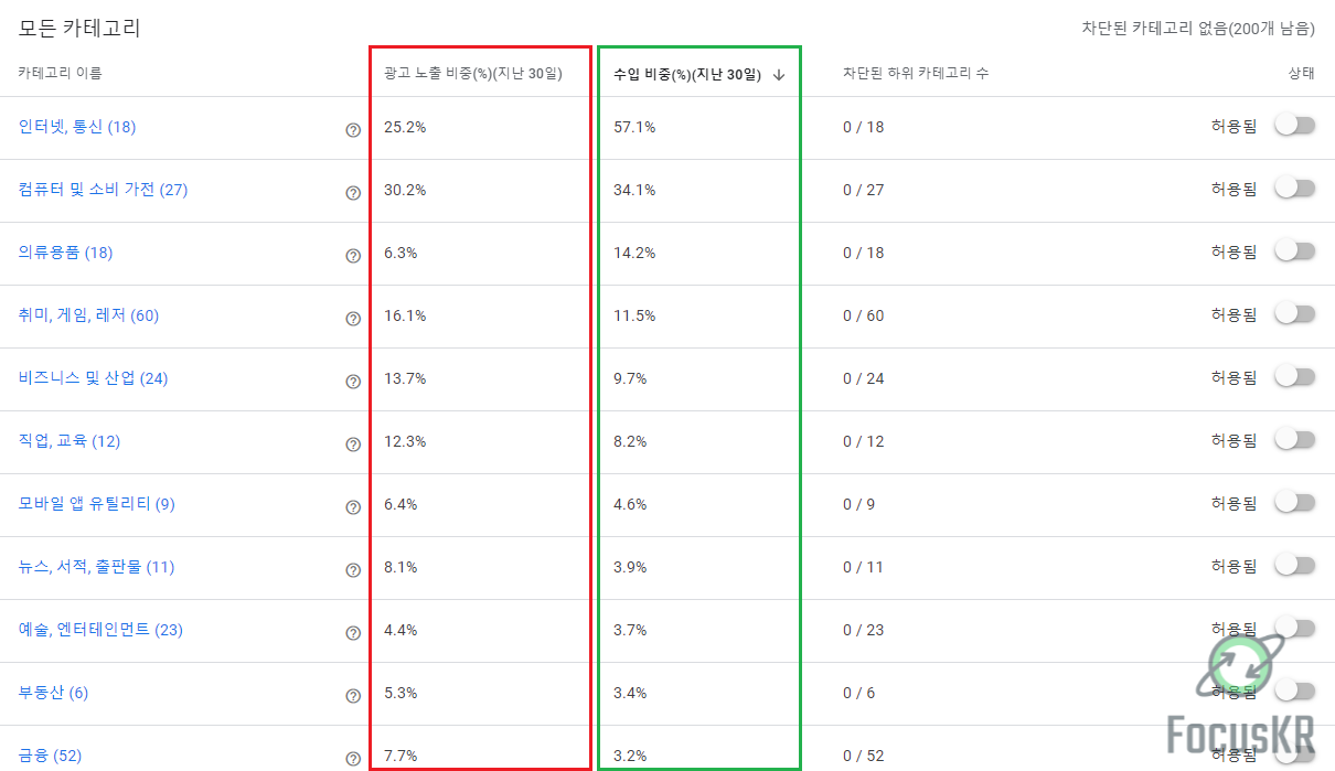 가장 중요한 것은 '차단 관리' - '모든 사이트' - '일반 카테고리' 관리에서 노출 대비 수익이 적은 광고는 계속 표시해도 수익이 적기 때문에 표시할 필요가 없으므로 차단하는 것이 좋습니다.