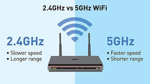 2.4 Ghz는 속도가 느린 대신 5 Ghz보다 넓은 범위를 커버하지만 5 Ghz는 빠른 속도를 지원하는 대신 빠른 만큼 좁은 범위로 인해 근거리에서는 빠르지만 멀어질수록 수신 감도가 떨어집니다.