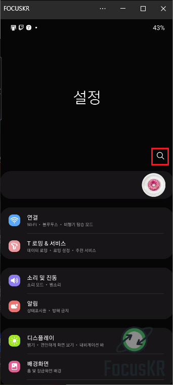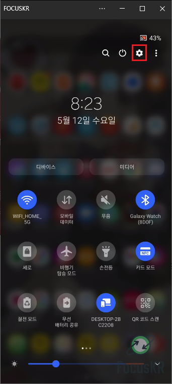 1. 상단바를 내리고 상단에 있는 설정을 눌러줍니다.