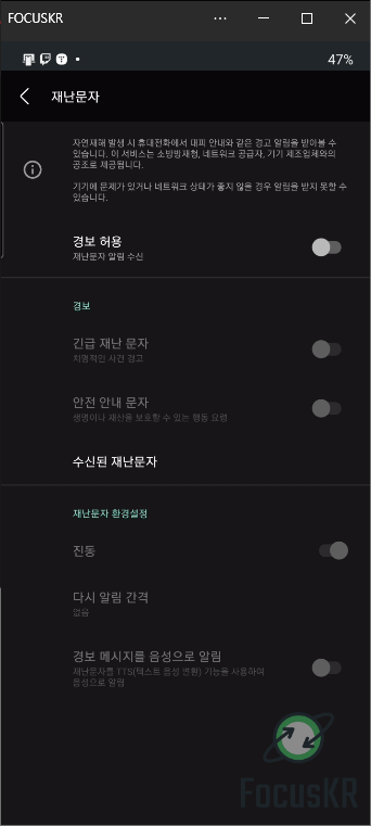 4. 해당 메뉴에서 재난문자를 컨트롤할 수 있습니다.