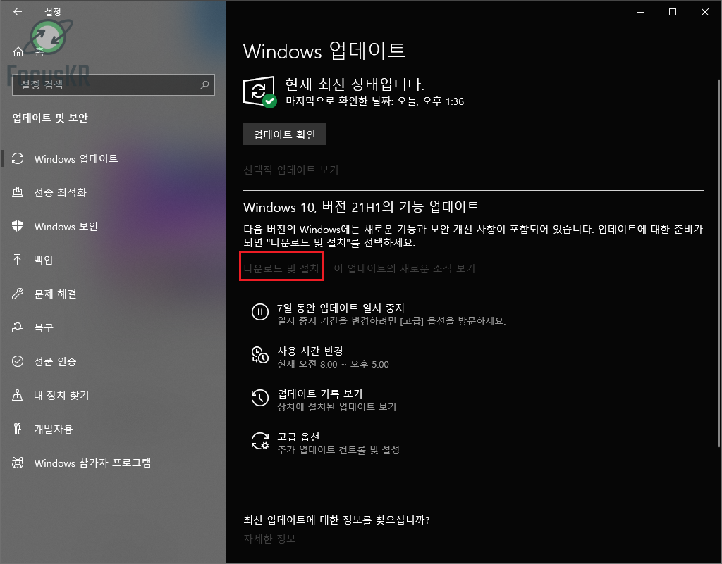 윈도우 업데이트를 통해서 21H1을 다운로드 및 설치하실 수 있으며 버전이 판올림 되는 것이므로 소요시간은 평균 15~30분 정도 소요되므로 다른 일을 하시는 경우에는 업데이트를 미루는 것을 권장합니다.