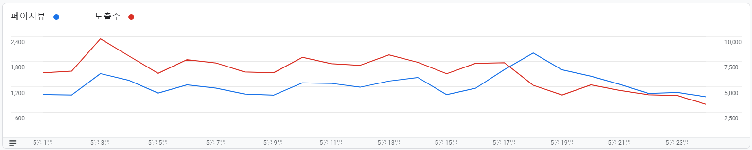 위 이미지를 보면 알 수 있듯이 5월 18일쯤부터 페이지 접근 횟수는 늘어나는데