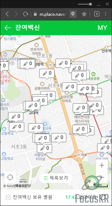 현재 위치 기반으로 주변에서 잔여백신 재고량이 표시가 되며 재고가 있는 곳에서
