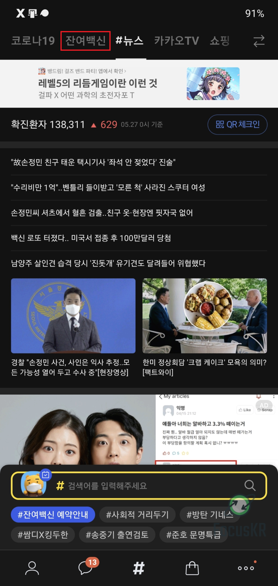 상단에 있는 '잔여백신'을 터치한 후 동의사항에 동의하신 후 네이버와 마찬가지로