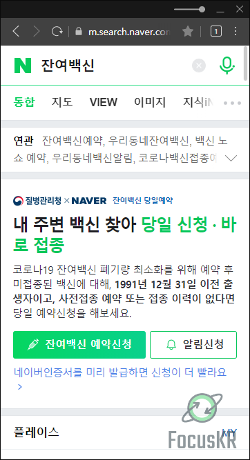 네이버 모바일에서 '잔여백신'이라고 검색을 하고 '잔여백신 예약신청'을 눌러줍니다.