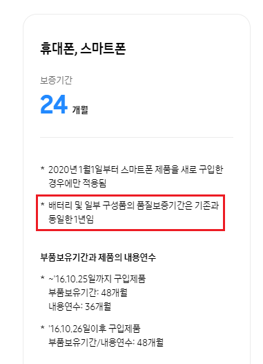 정확하게 정리해서 말씀드리면 2년으로 변경된 것은 사실이지만 배터리를 포함하여 일부 부품은 기존과 마찬가지로 1년이며 이 내용은 삼성전자 서비스센터에서 마치 보험 약관에 적혀 있는 깨알 같은 글씨로 기록되어 있는 부분입니다.