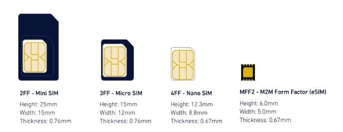 기존에 많이 쓰던 USIM(Universal Subscriber Identify Module)은 직접 칩을 삽입하여 인증하는 IC 카드 중 하나로 신용카드/체크카드 정면에 보이는 IC 칩 모듈과 같은 것이고 용도가 휴대폰 사용자 인증을 위한 방향으로 변경된 것이지만 사용자가 직접 삽입할 필요 없이 스마트폰 메인보드에 미리 내장되어 있는 SIM 카드에 정보만 다운로드하는 방식으로 사용이 가능한 것이 eSIM입니다.