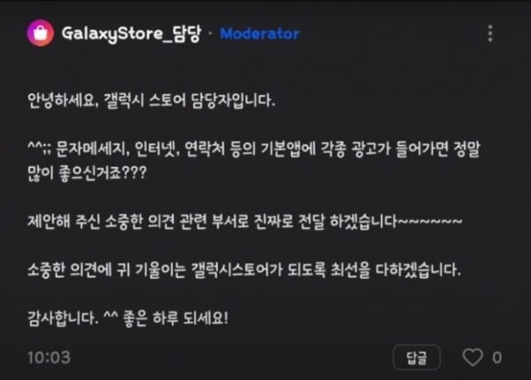 광고는 출력하되 사용자가 선택적으로 광고 출력을 끌 수 있는 옵션만 줘도 이런 논란은 시작도 안 했을 것이고 한다 해도 이 정도의 부정적인 여론들은 발생하지 않고 어느 정도는 잠잠해질 수 있을 거라 생각하는데 그 이유가 일부 삼성전자처럼 기본 앱에 광고를 표시하는 업체들이 있었지만 그 업체들은 광고 표시를 끌 수 있는 설정을 제공하고 있기 때문입니다. 삼성전자는 그 옵션마저 제공하고 있지 않기 때문에 이런 문제가 발생하고 있는 것입니다.