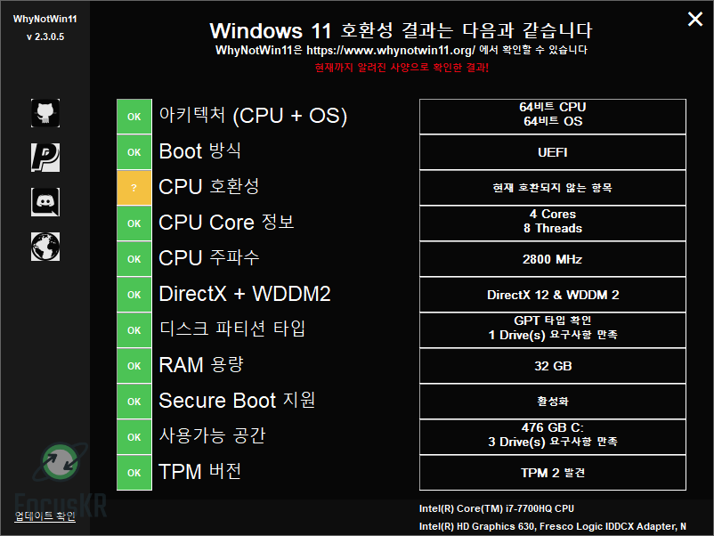 미리 확인할 수 있는 프로그램 중 가장 많이 유명한 것은 WhyNotWin11이라는 프로그램으로 현재 깃허브를 시작으로 많은 곳에서 알려지고 있고 무료 프로그램이므로 지금 바로 다운로드하셔서 확인할 수 있는 간단한 프로그램입니다.