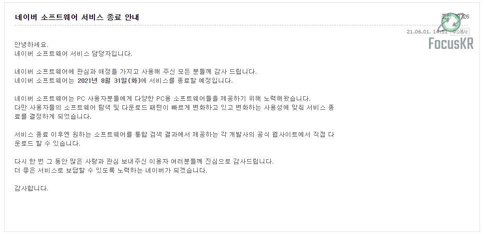 네이버 서비스에서 오래되고 지금까지도 서비스를 하고 있는 유틸리티 다운로드 및 자료실 역할을 하던 네이버 소프트웨어 서비스가 2021년 8월 31일 이후로 서비스가 종료가 되며 더 이상 이용할 수 없게 된다고 하며 이제 소프트웨어는 각각의 소프트웨어 공식 홈페이지를 통해서 다운로드할 것을 권장하는데 네이버가 서비스 종료하는 원인을 파악해봅시다.