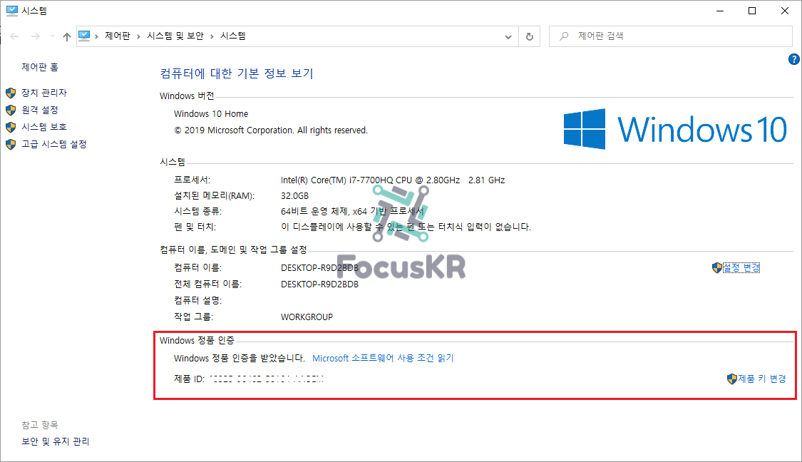 정품인증을 받은 상태인 경우 위와 같이 'Windows 정품 인증을 받았습니다.'라는 메시지가 보이게 됩니다.